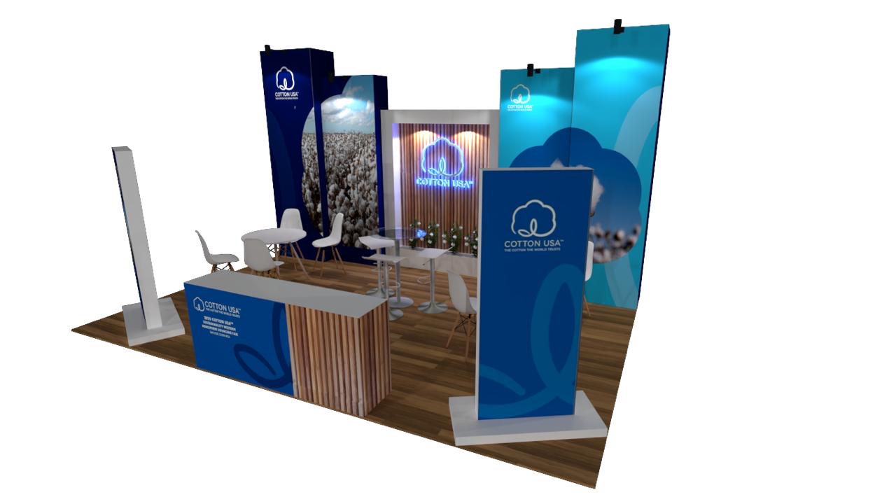 Stands ligeros y diseñados a medida con piso integrado, iluminación, mobiliario, impresión y soluciones audiovisuales.